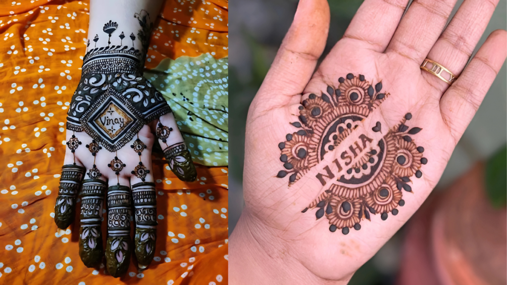 दुल्हन के हाथों में अपने और जीवनसाथी के नाम को आकर्षक पैटर्न में सजाया जाता है, जिससे डिजाइन