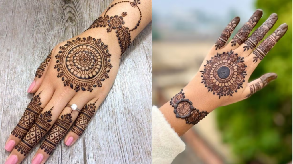 सममित और जटिल मंडला पैटर्न जो उंगलियों को एक खास और दिव्य रूप देते हैं।