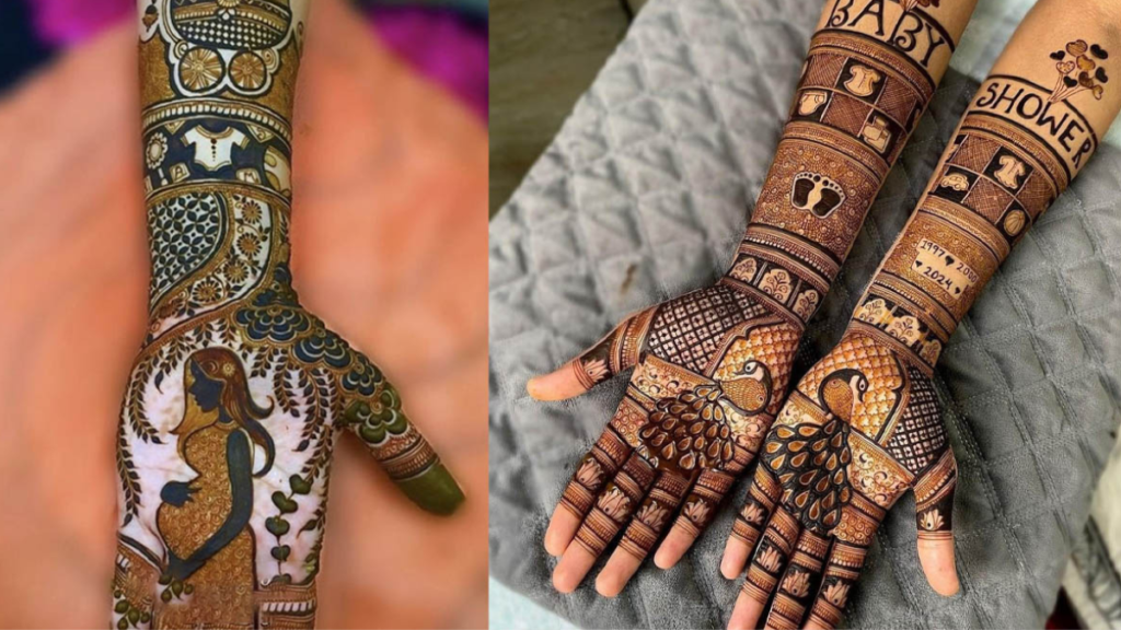 फुल हैंड मेहंदी डिज़ाइन में ऊपर के सारे एलिमेंट्स का संयोजन होता है